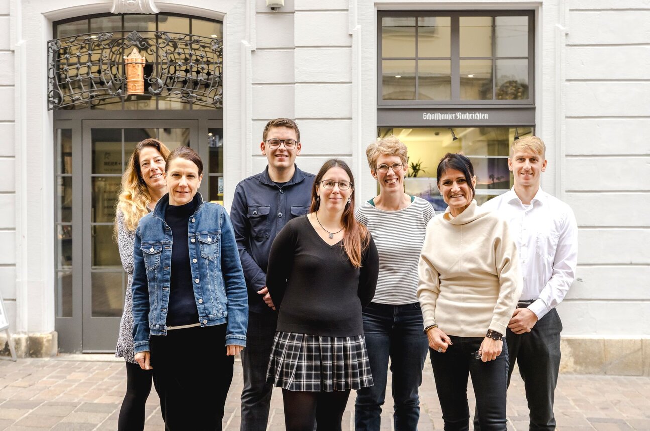 Karin Zünd am Meier Service Desk, Rebecca Kunz im Redaktionssekretariat, Kaspar Moser bei Radio Munot Betriebs AG, Joëlle Häubi im Digital Hub, Eva Schmid in der Redaktion der Schaffhauser Nachrichten, Marion Roost im Verkauf bei der Radio Munot Werbe AG und Timo Kälin im Aussendienst des Werbemarkts (v.l.n.r).